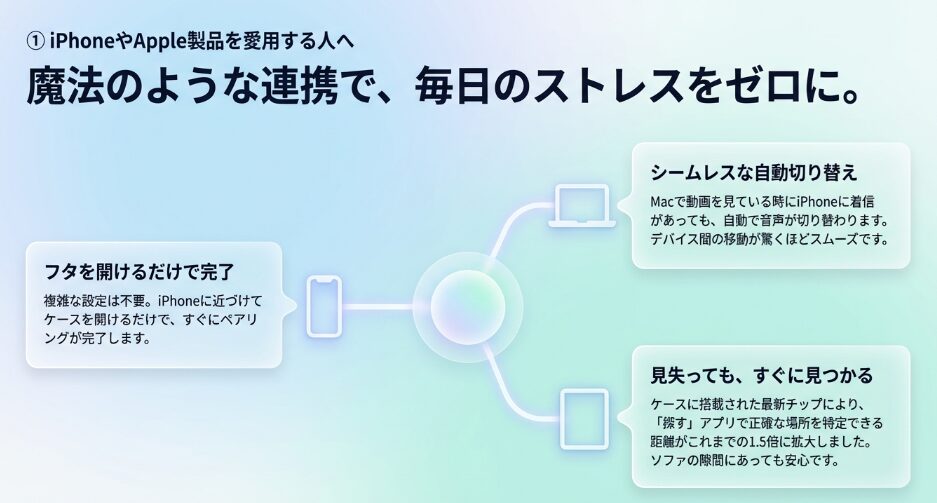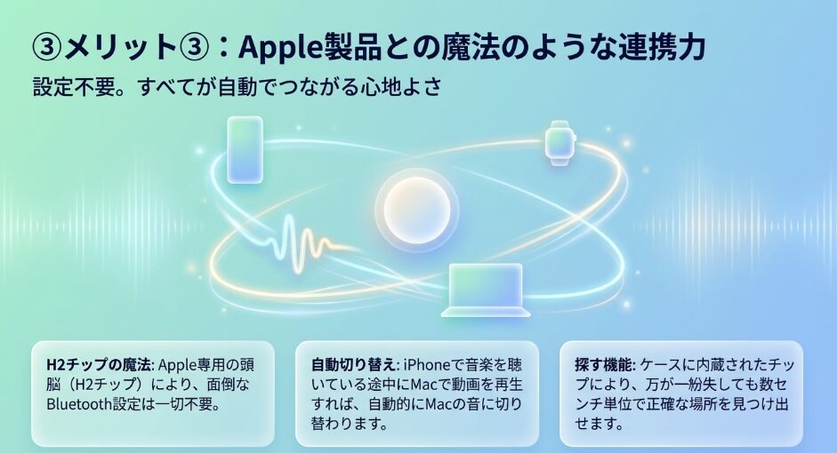 例えば、Apple製品間での自動切り替え機能は、一度体験すると他のイヤホンには戻れなくなるほどの心地よさがありますね。