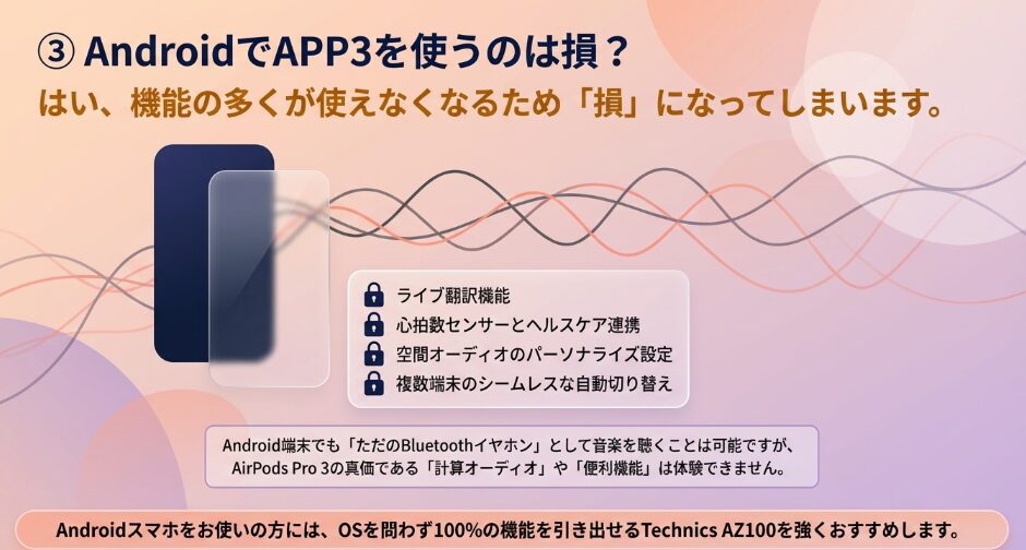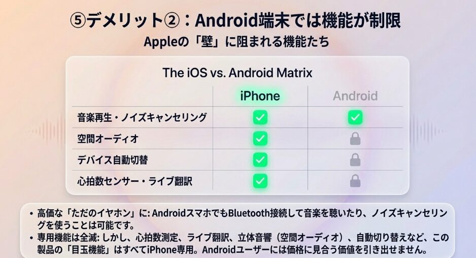 心拍数測定や自動デバイス切り替え、ライブ翻訳などの主要機能の多くがiPhone専用のため、十分に価値を享受できないからです。