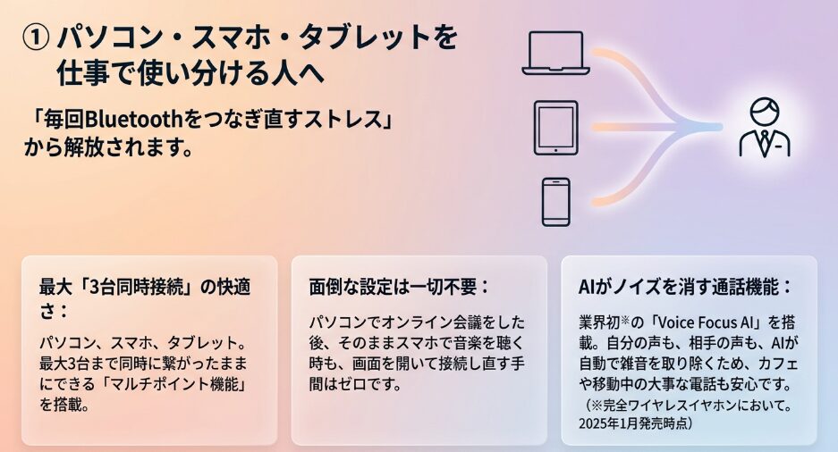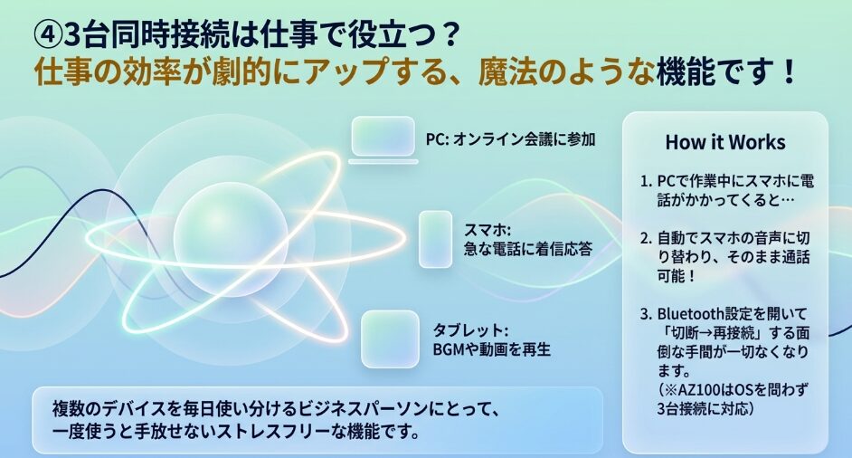 具体的に言いますと、EAH-AZ100は業界初の「3台マルチポイント」に対応しており、ビジネスシーンでも大きく活躍してくれます。
