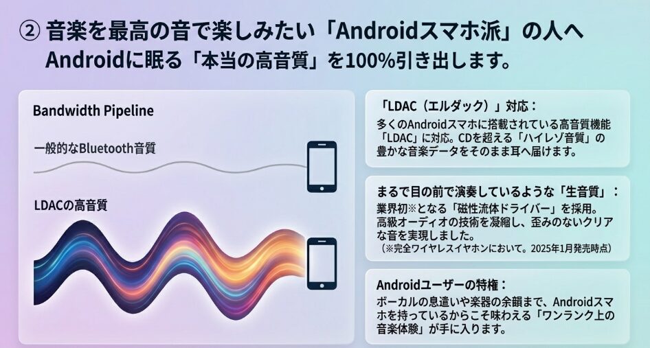 - Androidスマホを使い、LDACによるハイレゾ体験を楽しみたい人