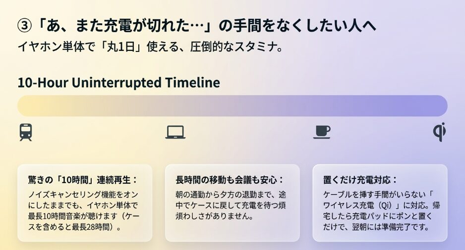忙しい毎日の中で、バッテリー残量を気にせずに音楽や仕事に集中できるのは嬉しいポイントです。