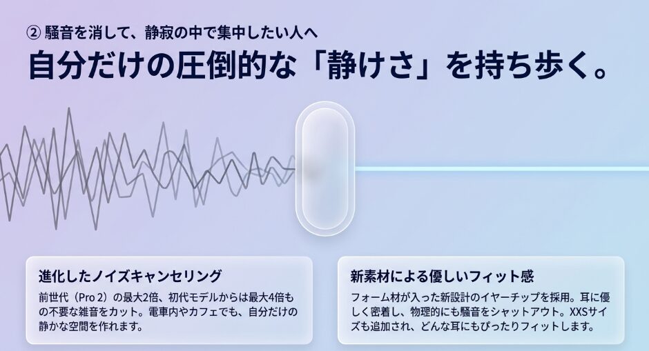 - AirPods Pro 3が達成した大幅なノイズ低減の使い心地